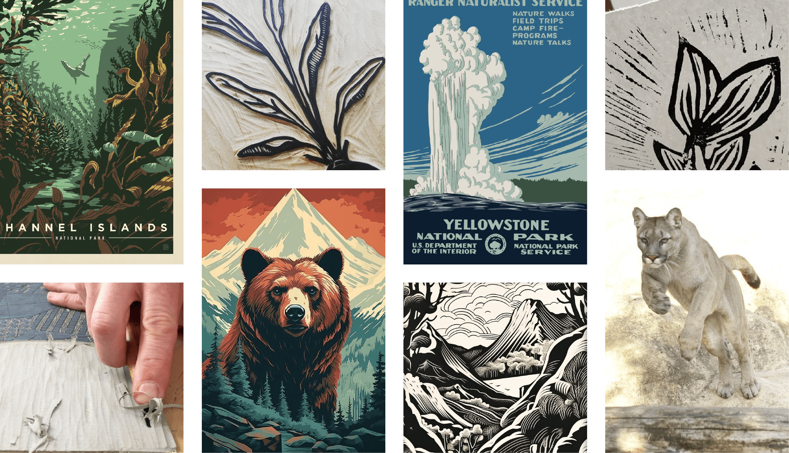 After researching and sketching various possibilities for the event's identity, I decided to pursue a direction inspired by the simplicity of vintage WPA National Park posters, combined with the intricate details and dynamic movement found in linocut illustrations.