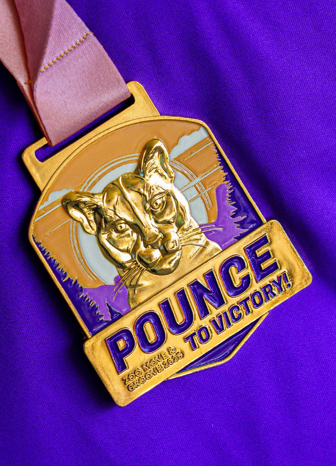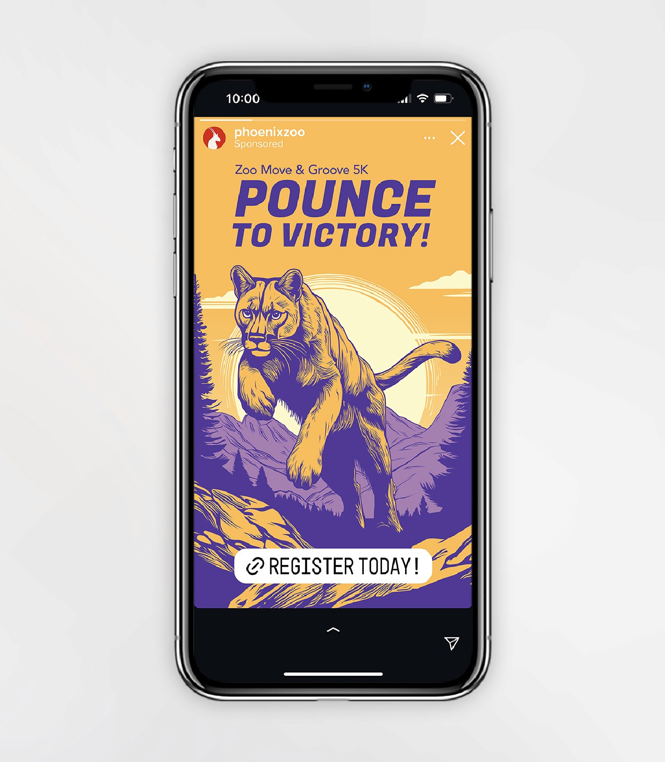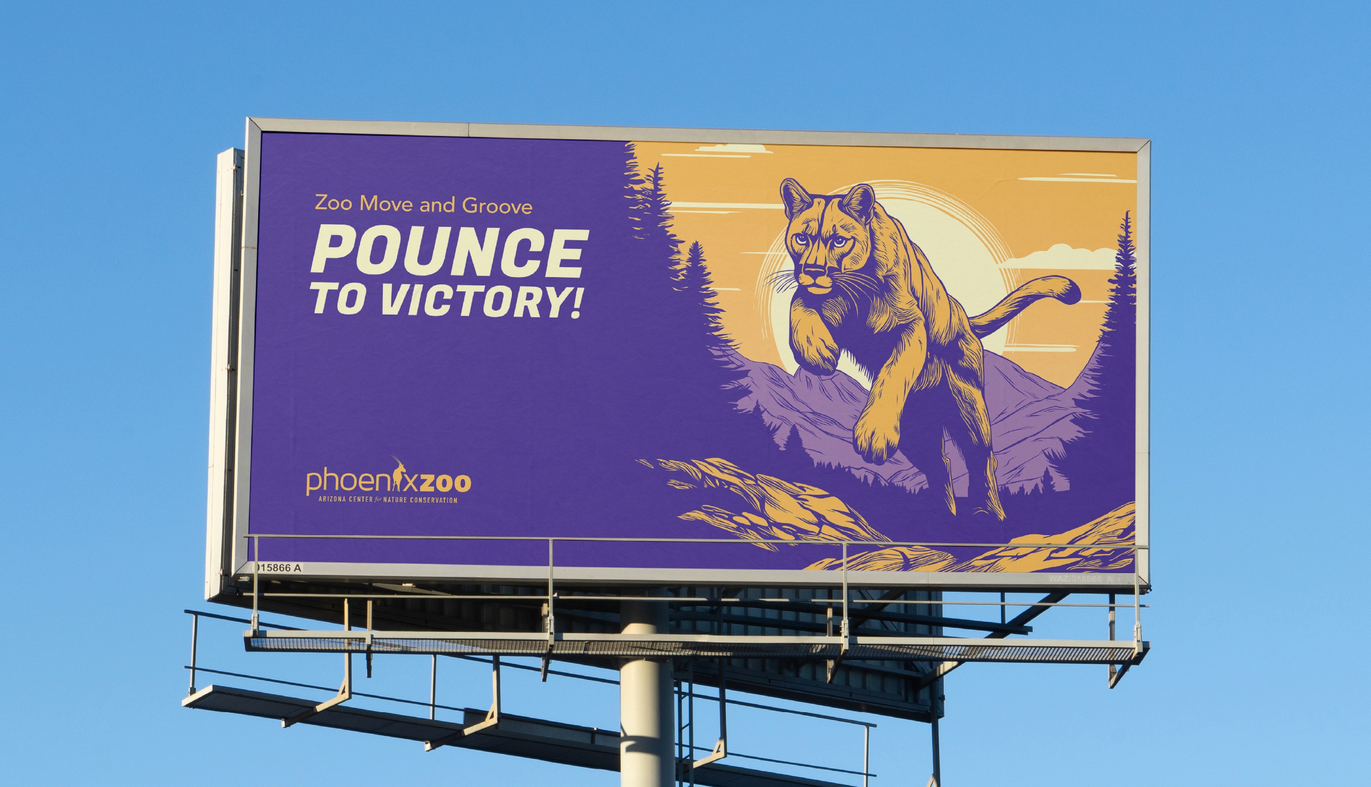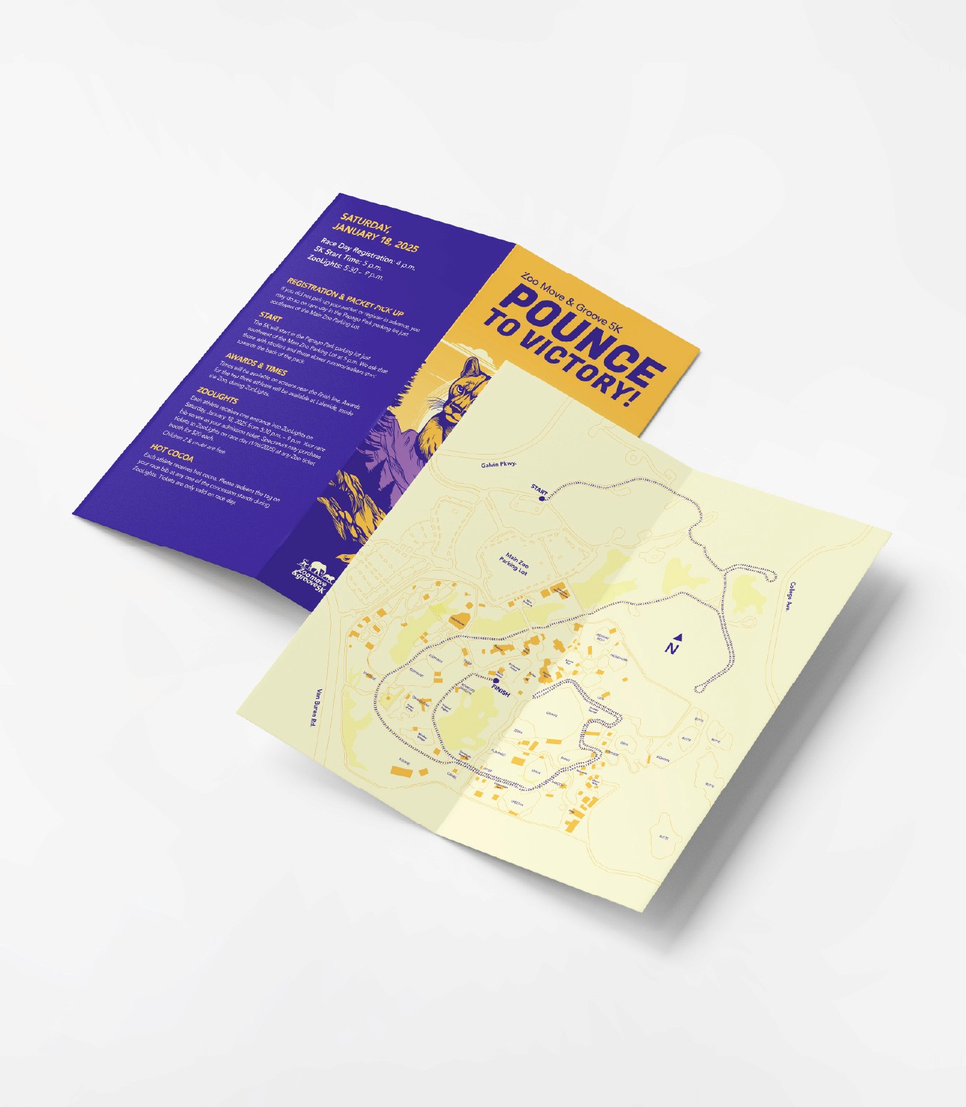 The tagline, typography, and color palette for the event were carefully chosen to emphasize its active nature. The tagline, "Pounce to Victory," was typeset in a modified version of Fugaz One across and paired with the Zoo's primary typeface, Avenir, to maintain integrity within the parent brand.